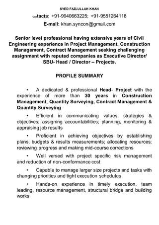 This document provides a summary of Syed Fazlullah Khan's professional experience and qualifications. Khan has over 30 years of experience in civil engineering project management, construction management, and contract management. He is seeking a new role as an executive director, SBU head, or director of projects for a reputable company. His experience includes managing large and complex construction projects on schedule and within budget.