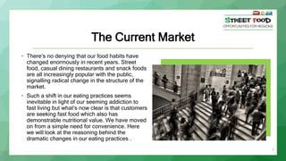The document discusses the significant shift in consumer eating habits toward street food and casual dining, driven by a demand for convenience and nutritional value. It highlights the rapid growth of the street food sector, emphasizing its appeal through quality, affordability, and multicultural influences, while also noting the impact of technology on food service. Additionally, it suggests strategies for businesses to leverage these trends and expand in the evolving market landscape.