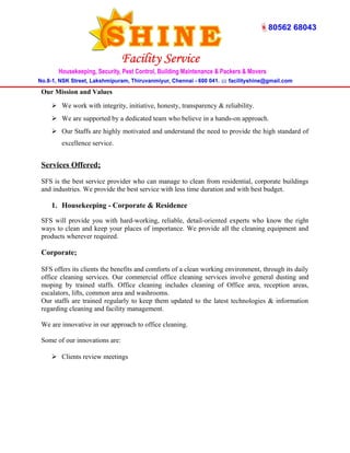 Shine Facility Service (SFS) provides various facility management services including housekeeping, security, pest control, manpower consulting, and building maintenance. It was founded in Chennai by Mr. T. Bhoopathiraja with 14 years of experience. SFS aims to satisfy customers with high quality and timely services. It trains employees on corporate manners, language, discipline, and punctuality. SFS's staff are reliable, dedicated professionals capable of understanding customer requirements. The company strives to achieve customer satisfaction, develop skilled professionals, and provide quality work in a timely manner.