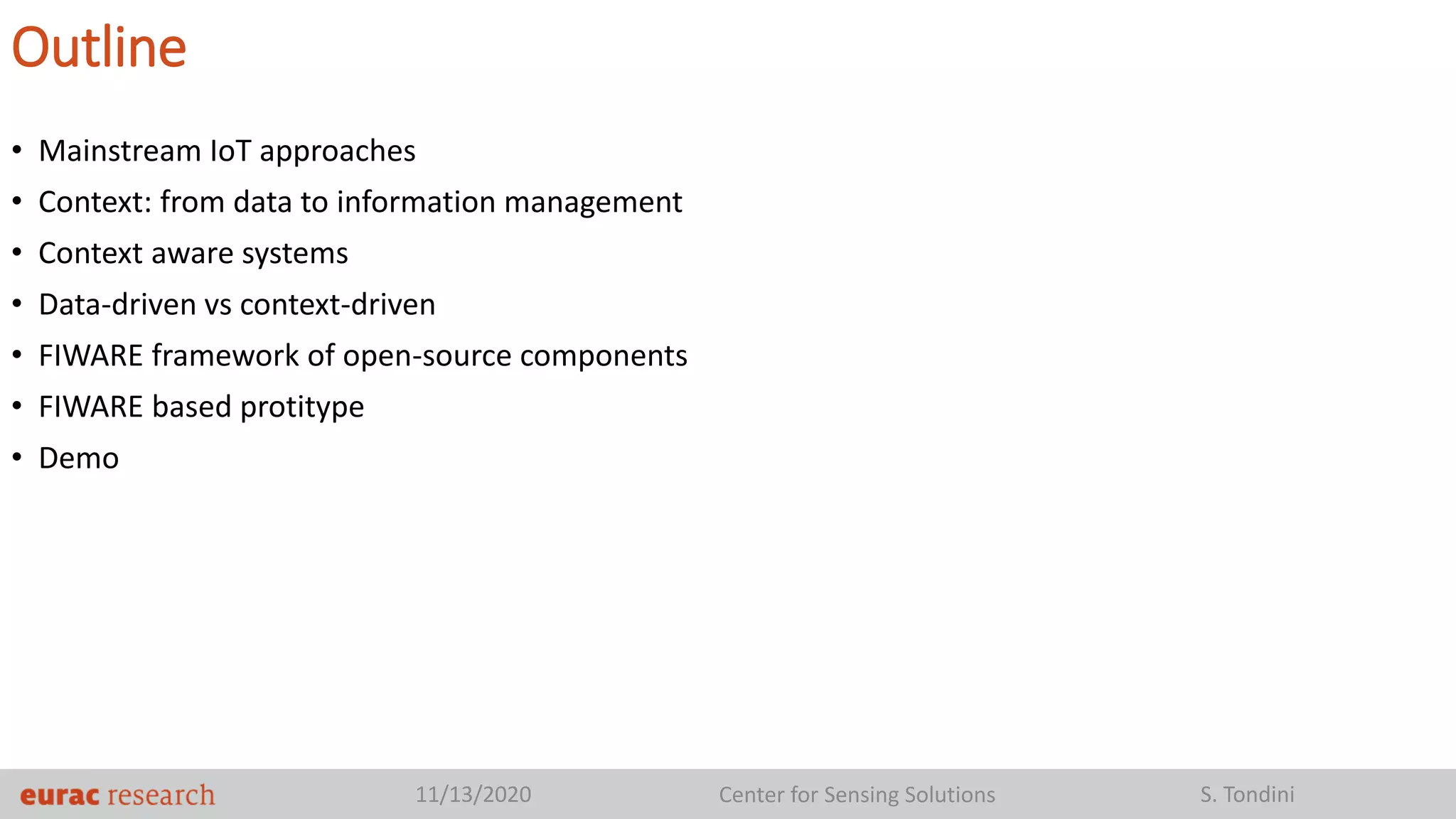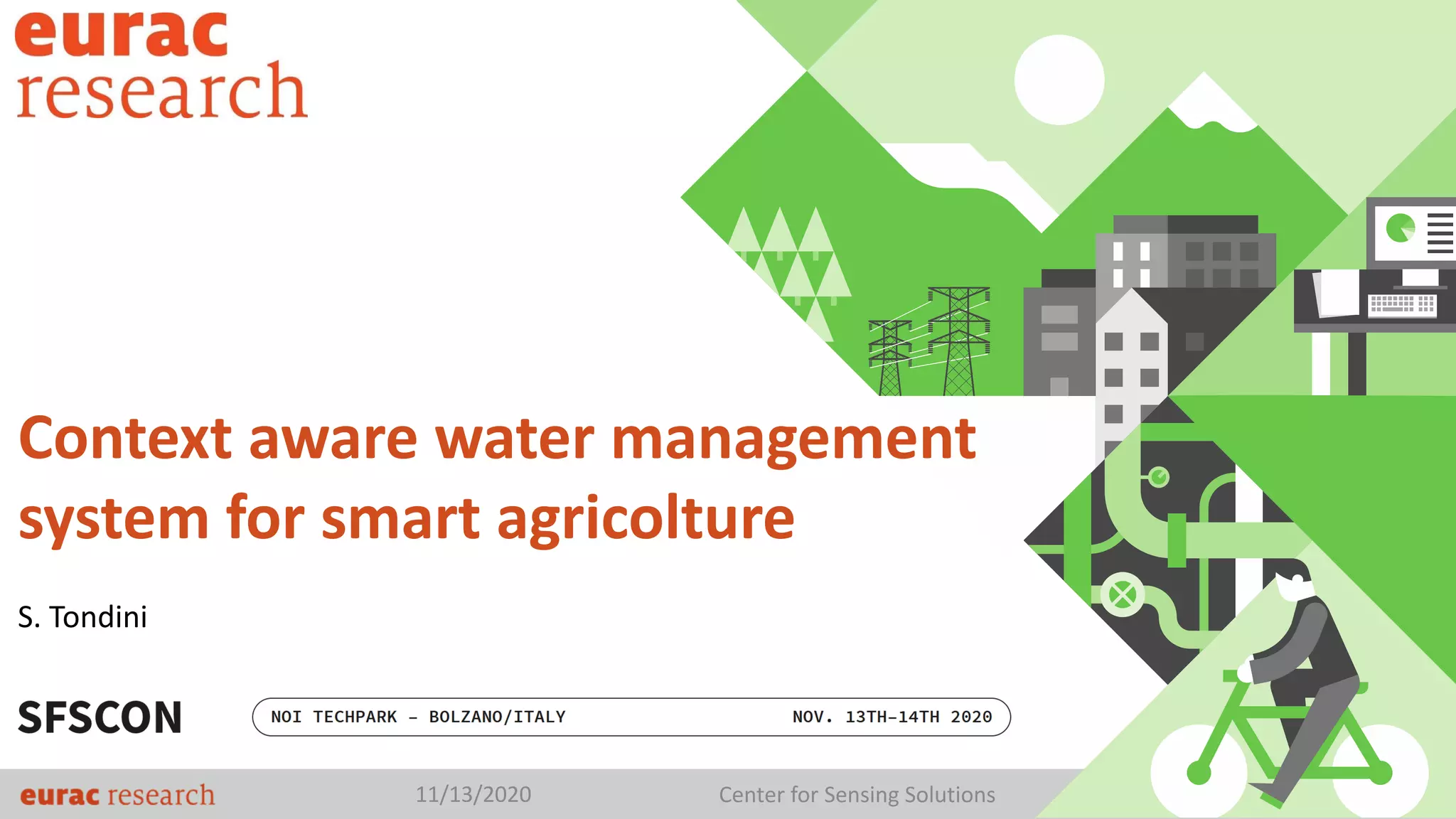 This document discusses context aware water management systems for smart agriculture using IoT technology. It describes mainstream IoT approaches and how context aware systems integrate heterogeneous data sources to build new contextual information that influences device behavior. The FIWARE open source framework is presented as a way to implement such a system using components like an IoT agent, MQTT broker, and context broker. A prototype is demonstrated using FIWARE components and sensors, actuators and an ultra light IoT agent to monitor soil moisture and control a pump in a vineyard irrigation system based on the environmental context.