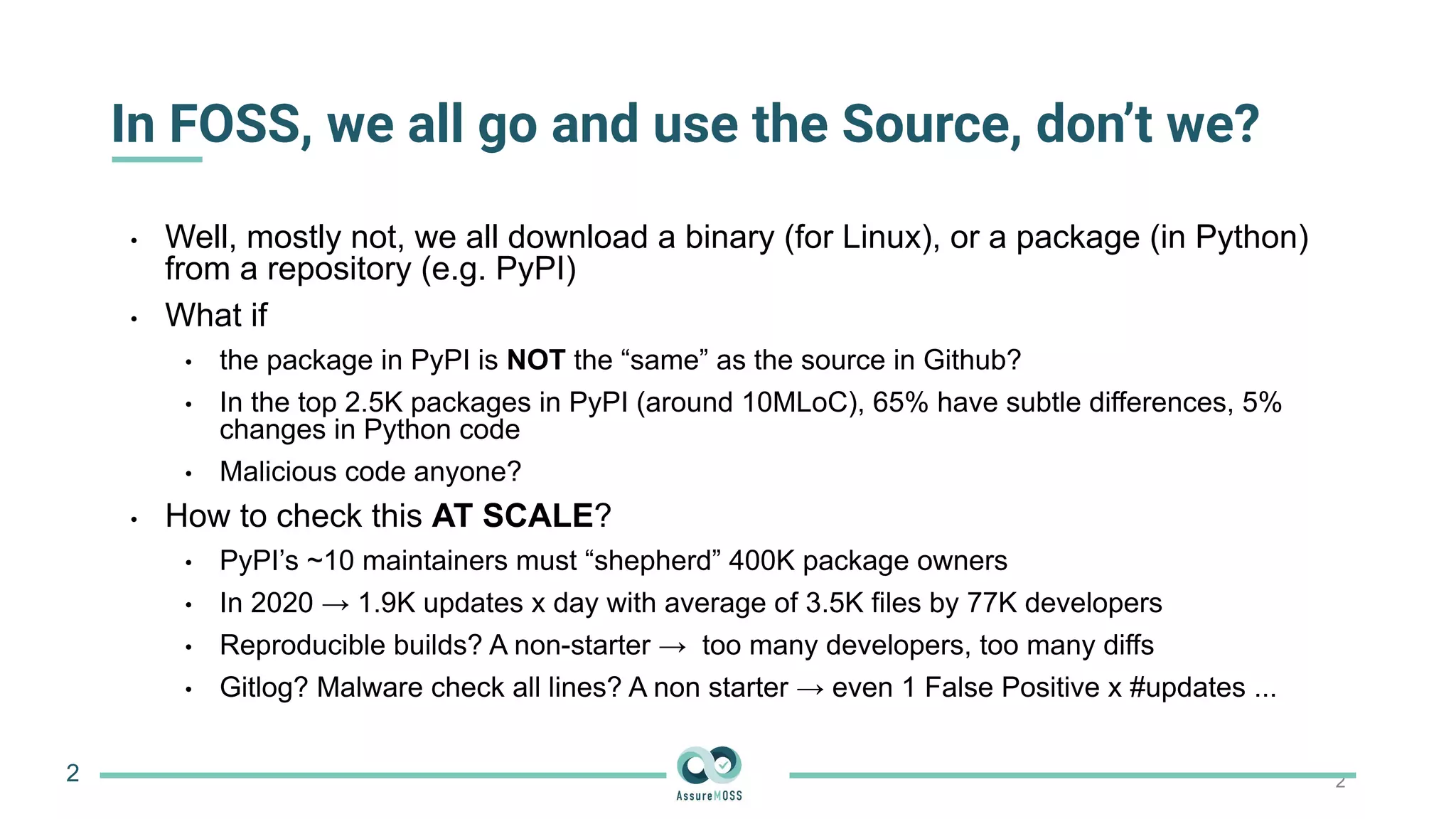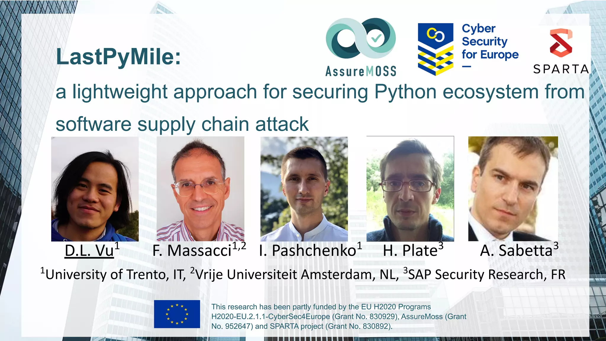 The document discusses a research project funded by various EU Horizon 2020 programs, focusing on a lightweight method called LastPymile for securing the Python ecosystem against software supply chain attacks. It highlights the prevalence of discrepancies between source code and distributed packages on PyPI, with a significant percentage of packages containing malicious code vulnerabilities. The paper outlines the challenges of verifying package security at scale and proposes solutions to improve the detection and prevention of code injection threats.