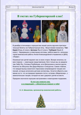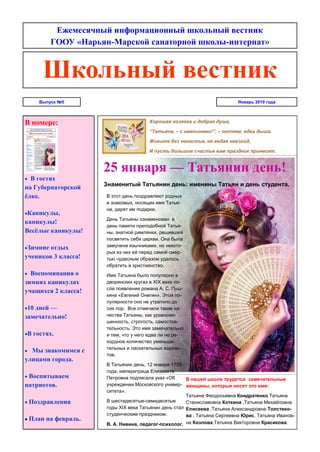 В январском выпуске школьного вестника описываются зимние каникулы учеников и их участие в новогодних мероприятиях, включая поездку на губернаторскую ёлку. Также уделяется внимание празднованию Татьяниного дня и патриотическому воспитанию детей через сказки. Обсуждаются различные впечатления и занятия детей во время каникул, такие как зимние забавы и поездки, что подчеркивает разнообразие их отдыха и активностей.