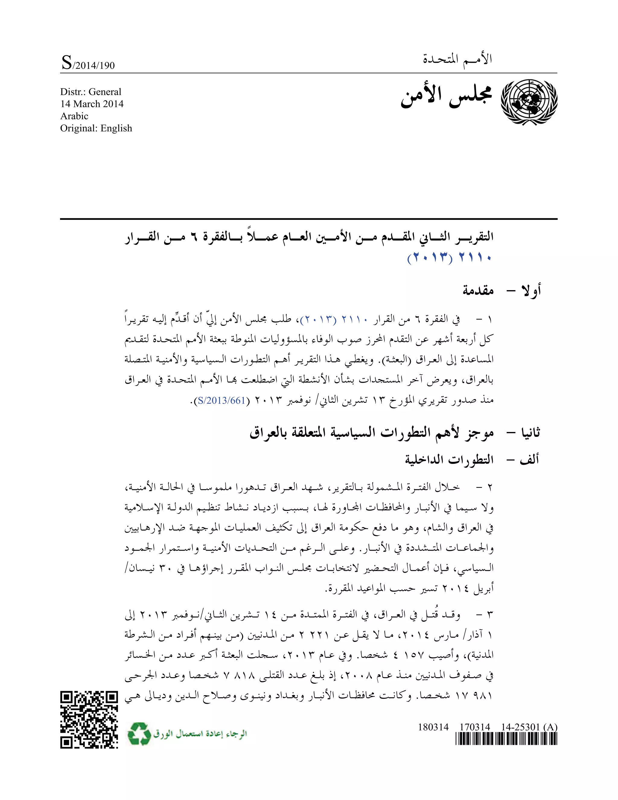 General 14 March 2014 Arabic Original: English 180314 170314 14-25301 (A) *1425301* ـﺎﻟﻔﻘﺮﺓـﺑــ ﹰﻼــﻋﻤــ ـﺎﻡـﺍﻟﻌــ ـﲔـﺍﻷﻣــ ـﻦـﻣــ ـﺪﻡـﺍﳌﻘــ ـﺎﱐـﺍﻟﺜــ ـﺮـﺍﻟﺘﻘﺮﻳــ٦ـﺮﺍﺭـﺍﻟﻘــ ـﻦـﻣــ ٢١١٠)٢٠١٣( ﺃﻭﻻ-ﻣﻘﺪﻣﺔ ١-ﺍﻟﻔﻘﺮﺓ ﰲ٦ﺍﻟﻘﺮﺍﺭ ﻣﻦ٢١١٠)٢٠١٣(ﺍﻷ ﳎﻠﺲ ﻃﻠﺐ ،ﱢﺪﺃﻗـ ﺃﻥ ﹼﱄﺇ ﻣﻦﹰﺍﺗﻘﺮﻳـﺮ ﺇﻟﻴـﻪ ﻡ ﻟﺘﻘـﺪﱘ ﺍﳌﺘﺤـﺪﺓ ﺍﻷﻣﻢ ﺑﺒﻌﺜﺔ ﺍﳌﻨﻮﻃﺔ ﺑﺎﳌﺴﺆﻭﻟﻴﺎﺕ ﺍﻟﻮﻓﺎﺀ ﺻﻮﺏ ﺍﶈﺮﺯ ﺍﻟﺘﻘﺪﻡ ﻋﻦ ﺃﺷﻬﺮ ﺃﺭﺑﻌﺔ ﻛﻞ ﺍﻟﻌـﺮﺍﻕ ﺇﱃ ﺍﳌﺴﺎﻋﺪﺓ)ﺍﻟﺒﻌﺜـﺔ.(ﻭﻳﻐﻄـﻲﻫـﺬﺍﺍﳌﺘـﺼﻠﺔ ﻭﺍﻷﻣﻨﻴـﺔ ﺍﻟـﺴﻴﺎﺳﻴﺔ ﺍﻟﺘﻄـﻮﺭﺍﺕ ﺃﻫـﻢ ﺍﻟﺘﻘﺮﻳـﺮ ﺍﺿ ﺍﻟﱵ ﺍﻷﻧﺸﻄﺔ ﺑﺸﺄﻥ ﺍﳌﺴﺘﺠﺪﺍﺕ ﺁﺧﺮ ﻭﻳﻌﺮﺽ ،ﺑﺎﻟﻌﺮﺍﻕﺍﻟﻌـﺮﺍﻕ ﰲ ﺍﳌﺘﺤـﺪﺓ ﺍﻷﻣـﻢ ﻬﺑـﺎ ﻄﻠﻌﺖ ﺍﳌﺆﺭﺥ ﺗﻘﺮﻳﺮﻱ ﺻﺪﻭﺭ ﻣﻨﺬ١٣ﺍﻟﺜﺎﱐ ﺗﺸﺮﻳﻦ/ﻧﻮﻓﻤﱪ٢٠١٣)S/2013/661.( ﺛﺎﻧﻴﺎ-ﺑﺎﻟﻌﺮﺍﻕ ﺍﳌﺘﻌﻠﻘﺔ ﺍﻟﺴﻴﺎﺳﻴﺔ ﺍﻟﺘﻄﻮﺭﺍﺕ ﻷﻫﻢ ﻣﻮﺟﺰ ﺃﻟﻒ-ﺍﻟﺪﺍﺧﻠﻴﺔ ﺍﻟﺘﻄﻮﺭﺍﺕ ٢-ـﺎﻟـﺑ ـﺸﻤﻮﻟﺔـﺍﳌ ـﺮﺓـﺍﻟﻔﺘ ـﻼﻝـﺧ،ـﺔـﺍﻷﻣﻨﻴ ـﺔـﺍﳊﺎﻟ ﰲ ـﺎـﻣﻠﻤﻮﺳ ـﺪﻫﻮﺭﺍـﺗ ـﺮﺍﻕـﺍﻟﻌ ـﻬﺪـﺷ ،ﺘﻘﺮﻳﺮ ﻭﻻـﻼﻣﻴﺔـﺍﻹﺳ ـﺔـﺍﻟﺪﻭﻟ ـﻴﻢـﺗﻨﻈ ـﺸﺎﻁـﻧ ـﺎﺩـﺍﺯﺩﻳ ـﺴﺒﺐـﺑ ،ـﺎـﳍ ـﺎﻭﺭﺓـﺍﺠﻤﻟ ـﺎﺕـﻭﺍﶈﺎﻓﻈ ـﺎﺭـﺍﻷﻧﺒ ﰲ ـﻴﻤﺎـﺳ ﰲﺿـﺪ ﺍﳌﻮﺟﻬـﺔ ﺍﻟﻌﻤﻠﻴـﺎﺕ ﺗﻜﺜﻴﻒ ﺇﱃ ﺍﻟﻌﺮﺍﻕ ﺣﻜﻮﻣﺔ ﺩﻓﻊ ﻣﺎ ﻭﻫﻮ ،ﻭﺍﻟﺸﺎﻡ ﺍﻟﻌﺮﺍﻕﺍﻹﺭﻫـﺎﺑﻴﲔ ـﺎﺭـﺍﻷﻧﺒـ ﰲ ـﺸﺪﺩﺓـﺍﳌﺘـ ﻭﺍﳉﻤﺎﻋــﺎﺕ.ﺍ ـﻰـﻭﻋﻠــﻮﺩـﺍﳉﻤـ ـﺘﻤﺮﺍﺭـﻭﺍﺳـ ـﺔـﺍﻷﻣﻨﻴـ ـﺪﻳﺎﺕـﺍﻟﺘﺤـ ﻣــﻦ ـﺮﻏﻢـﻟـ ﰲ ـﺎـﺇﺟﺮﺍﺅﻫ ـﺮﺭـﺍﳌﻘ ـﻮﺍﺏـﺍﻟﻨ ـﺲـﳎﻠ ـﺎﺕـﻻﻧﺘﺨﺎﺑ ـﻀﲑـﺍﻟﺘﺤ ـﺎﻝـﺃﻋﻤ ـﺈﻥـﻓ ،ـﺴﻴﺎﺳﻲـﺍﻟ٣٠ـﺴﺎﻥـﻧﻴ/ ﺃﺑﺮﻳﻞ٢٠١٤ﺍﳌﻘﺮﺭﺓ ﺍﳌﻮﺍﻋﻴﺪ ﺣﺴﺐ ﺗﺴﲑ. ٣-ﹸﻗ ﻭﻗــﺪﻣــﻦ ﺍﳌﻤﺘــﺪﺓ ﺍﻟﻔﺘــﺮﺓ ﰲ ،ﺍﻟﻌــﺮﺍﻕ ﰲ ﺘــﻞ١٤ﺍﻟﺜــﺎﱐ ﺗــﺸﺮﻳﻦ/ﻧــﻮﻓﻤﱪ٢٠١٣ﺇﱃ ١ﺁﺫﺍﺭ/ـﺎﺭﺱـﻣ٢٠١٤ﻻ ـﺎـﻣ ،ـﻦـﻋ ـﻞـﻳﻘ٢٢١٢ـﺪﻧﻴﲔـﺍﳌ ـﻦـﻣ)ـﺸﺮﻃﺔـﺍﻟ ـﻦـﻣ ـﺮﺍﺩـﺃﻓ ـﻬﻢـﺑﻴﻨ ـﻦـﻣ ﺍﳌﺪﻧﻴﺔ(ﻭﺃﺻﻴﺐ ،١٥٧٤ﺷﺨﺼﺎ.ﻋـﺎﻡ ﻭﰲ٢٠١٣ﺍﳋـﺴﺎﺋﺮ ﻣـﻦ ﻋـﺪﺩ ﺃﻛـﱪ ﺍﻟﺒﻌﺜـﺔ ﺳـﺠﻠﺖ ، ـﺎﻡـﻋ ـﺬـﻣﻨ ـﺪﻧﻴﲔـﺍﳌ ـﻔﻮﻑـﺻ ﰲ٢٠٠٨ـﻰـﺍﻟﻘﺘﻠ ـﺪﺩـﻋ ـﻎـﺑﻠ ﺇﺫ ،٨١٨٧ـﻰـﺍﳉﺮﺣ ـﺪﺩـﻭﻋ ـﺼﺎـﺷﺨ ٩٨١١٧ـﺼﺎـﺷﺨ.ــﺍﻟ ـﻼﺡـﻭﺻ ـﻮﻯـﻭﻧﻴﻨ ـﺪﺍﺩـﻭﺑﻐ ـﺎﺭـﺍﻷﻧﺒ ـﺎﺕـﳏﺎﻓﻈ ـﺖـﻭﻛﺎﻧـﻲـﻫ ـﺎﱃـﻭﺩﻳ ﺪﻳﻦ