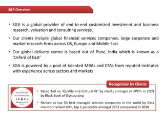 SGA is a global provider of customized investment research and consulting services. It has a global delivery center in Pune, India staffed by experienced professionals like MBAs and CFAs. SGA has been highly rated by its clients for quality and cultural fit. It offers services including research, analytics, valuations and advisory across various sectors. SGA works with clients in financial services and other industries to help with tasks such as market intelligence, customer profiling, and primary/secondary research analysis.