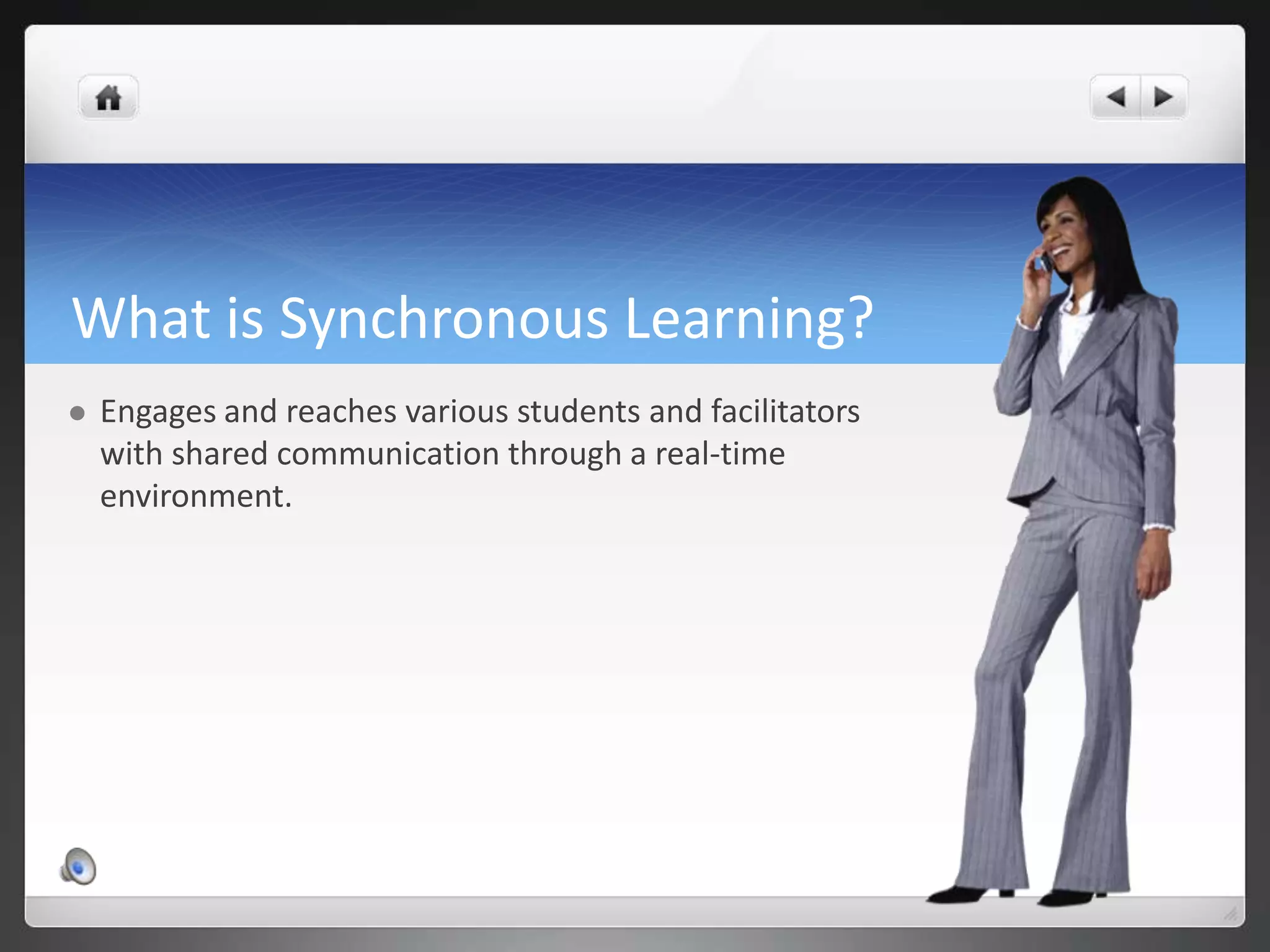 Synchronous online learning engages students and instructors through real-time communication. It offers conveniences like flexibility and timely feedback, but also constraints like time limits and technical requirements. Effective facilitation requires mandatory participation, clear expectations, and interactive tools like chat rooms, audio/video conferencing, and shared applications to enhance engagement. While convenient, synchronous learning may not be suitable for all learning styles and pros must be weighed against cons.