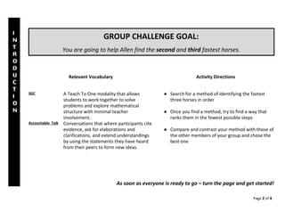 Allen has 25 horses that he needs to rank by speed. He can only race 5 horses at a time on his track. To find the fastest horse, Allen raced groups of 5 horses at a time, with the winner racing again with 4 new horses. This was done over 6 races to determine the overall fastest horse. The challenge for small groups is to determine a method to identify the second and third fastest horses using the fewest number of races. Groups will develop and compare methods before selecting the best approach.