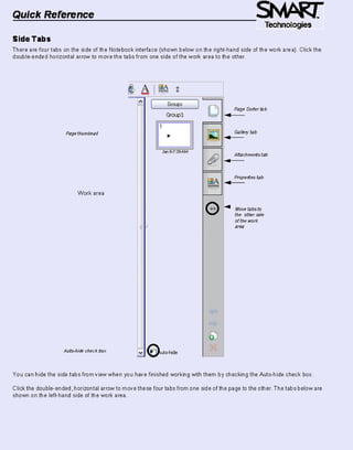 This document provides a tutorial on using a SMART Board for novice users. It covers the basic hardware setup, touch functionality, use of the pen tray tools, orienting and calibrating the board, using the on-screen keyboard and right click, writing and erasing, capturing portions of the screen, and exploring the notebook toolbar functions like inserting pages, tables, shapes, and using different pen tools.