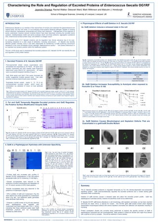The excreted proteome of Enterococcus faecalis OG1RF is temporally regulated by the Fsr two-component signalling system. GelE post-translationally regulates excreted proteins and a gelE mutant constitutively expresses SalB. Deletion of salB causes stress and alters the excreted protein profile. SalB has peptidoglycan hydrolase activity but its specificity could not be determined. A salB mutant shows cell morphology and septation defects that are exacerbated in a gelE/salB double mutant, with severe septation anomalies and defective cell separation.