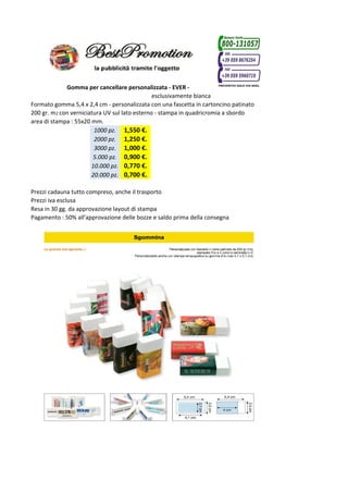 Il documento descrive gomma per cancellare personalizzata di dimensioni 5,4 x 2,4 cm, con opzioni di stampa in quadricromia e fascetta in cartoncino. I prezzi per ordini variabili da 1.000 a 20.000 pezzi vanno da 1,550 € a 0,700 € cadauno, comprensivi di trasporto e IVA esclusa. Il pagamento è suddiviso in un acconto del 50% all'approvazione del layout e il saldo prima della consegna.