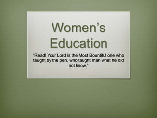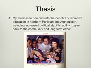 The document discusses the benefits of educating women in northern Pakistan and Afghanistan. It provides statistics showing lower literacy and school life expectancy for girls compared to boys in those regions. Educating girls can help reduce infant mortality, increase political stability, and fight extremism by providing economic opportunities and alternatives to madrassas. It also lowers fertility rates and has long-term positive effects as educated women become teachers and role models in their communities.