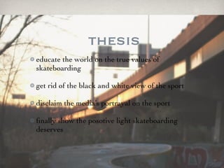 This document discusses the stereotypes and misconceptions around skateboarding culture. It aims to educate people on the true values of skateboarding by showing its positive light and disclaiming negative media portrayals. Skateboarding is described as having many faces that make its image hard to grasp, breeding speculation and misconceptions. The document highlights different skateboarding subcultures defined by music, terrain, and attitude rather than just the mainstream stereotypes promoted by competitions and retail.