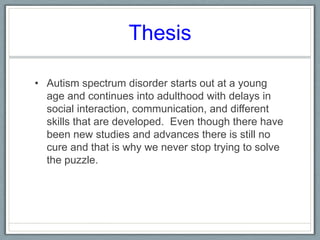 Autism spectrum disorder is a developmental disorder that begins early in life and is characterized by delays in social interaction, communication, and other skills. While research has advanced our understanding, there is still no known cure. People with autism exhibit a range of symptoms and behaviors across different areas like social skills, language, and repetitive behaviors. Treatment approaches aim to help individuals with autism develop skills and manage symptoms, but there is no single treatment and needs vary per individual. Further research continues toward finding effective treatments and ultimately a cure.