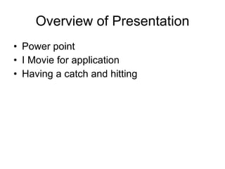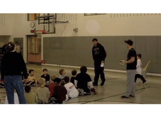 The document discusses coaching baseball and involves conditioning players, teaching techniques for hitting, pitching, fielding, and developing strategies. The author presents on these topics and describes conducting a baseball clinic for children to demonstrate fielding, throwing, base running, and catching techniques.