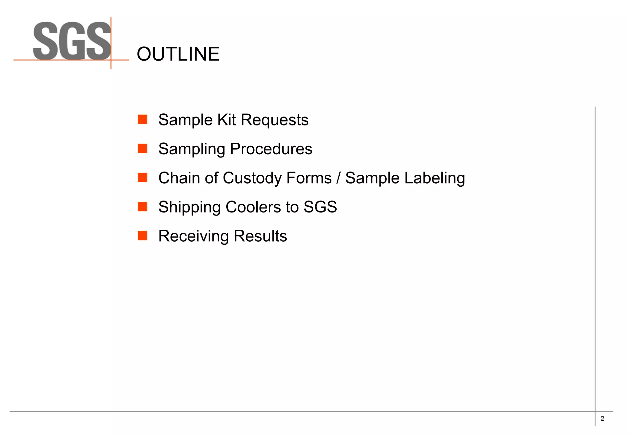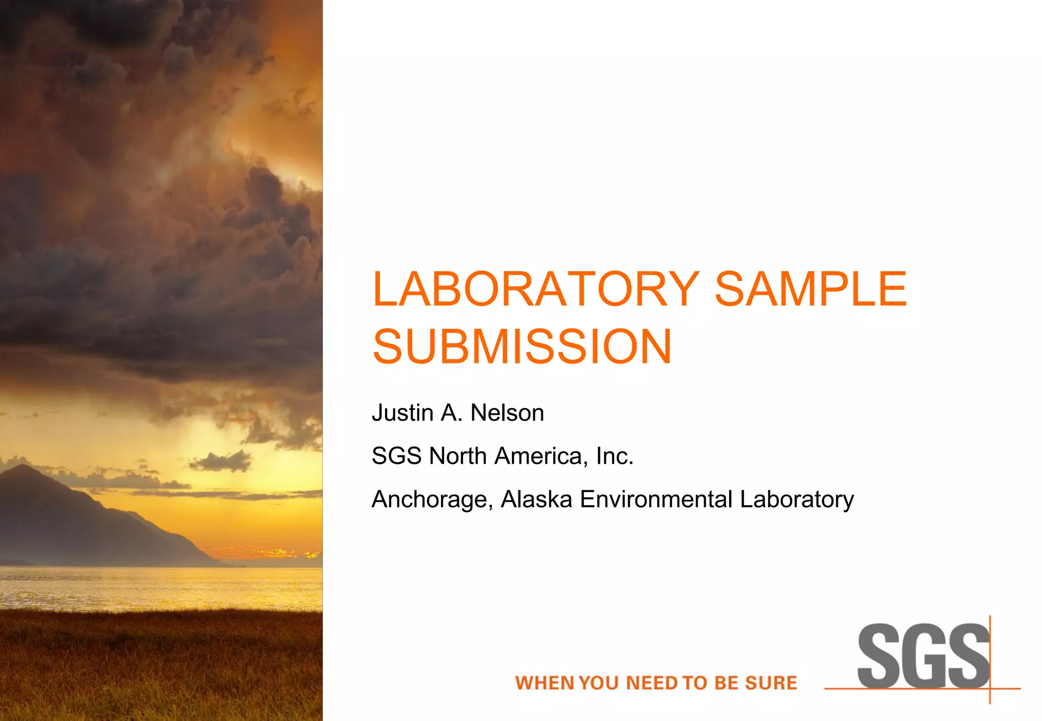 This document provides guidelines for submitting laboratory samples to SGS North America, including requesting sample kits, proper sampling and labeling procedures, chain of custody forms, packing and shipping samples, and receiving results. Key points covered include requesting the appropriate amount of sample for each analysis, filling and labeling volatile organic analysis containers correctly, completing chain of custody forms, using bubble wrap and absorbent pads when packing coolers, and accessing data online through the Engage portal.