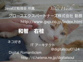 Yukei Wachi グロースエクスパートナーズ株式会社 勤務 http://www.gxp.co.jp/index.html 和智 右桂 ネコ好き IT アーキテクト @digitalsoul0124 Digital Romanticism http://d.hatena.ne.jp/digitalsoul Photo by @digitalsoul0124 All rights reserved.