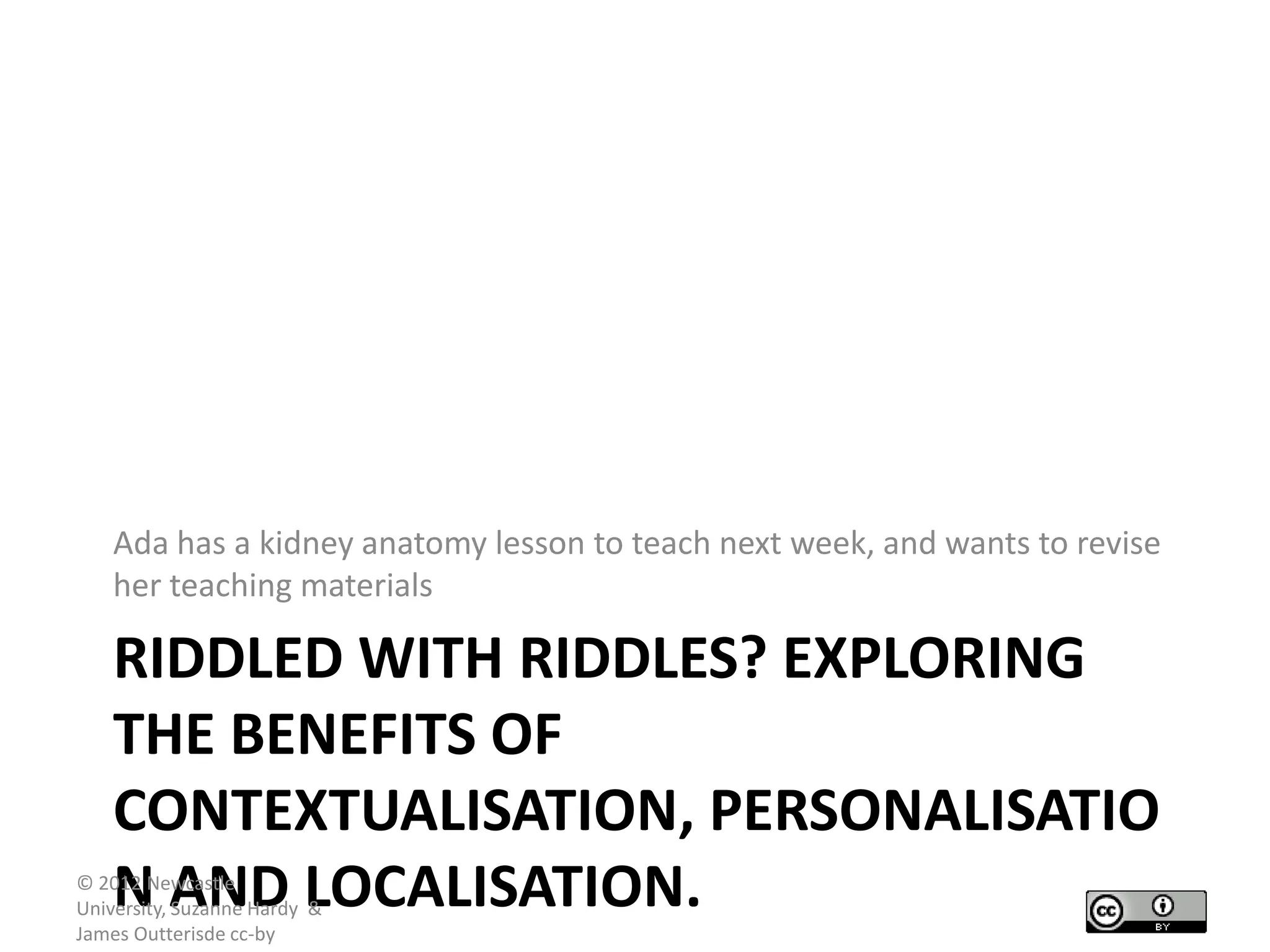 The document discusses revising teaching materials using open educational resources (OER) and contextualizing content. It describes a hypothetical scenario where a teacher named Ada revises her kidney anatomy lesson by incorporating OER and feedback from previous students. Ada finds relevant OER and images to update her PowerPoint presentation for the lesson. The document promotes linking and remixing open content within a teaching context.