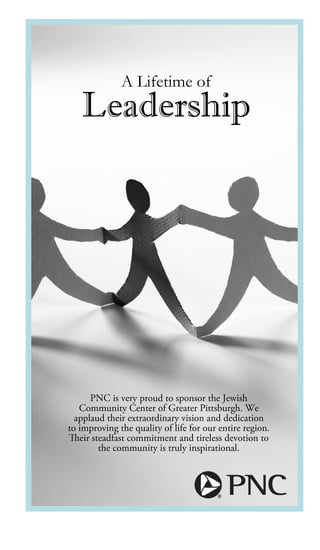 This document is a program guide for the Spring 2011 semester at the Jewish Community Center of Greater Pittsburgh's South Hills branch. It includes an index of programs and activities offered in various categories such as adults, aquatics, camps, children, dance, early childhood education, families, fitness, community programs, personal training, preschool sports, SilverSneakers, special needs, sports and recreation, teens, travel, and youth sports. It also provides information on membership benefits and rates, as well as a short article recognizing donors who have significantly supported the JCC.