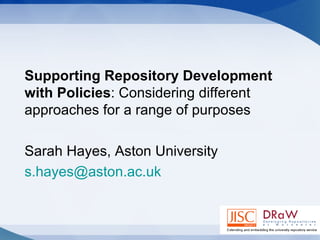 The document discusses different approaches to repository policies at Worcester University for their research repository (WRaP) and content repository for learning materials (CoRE). Initially WRaP had no mandate but emphasized showcasing research outputs, while CoRE faced poor uptake and abandoned metadata reviews. Recommendations include allowing different material types and access restrictions, embracing open resources, and linking repositories to learning management systems.