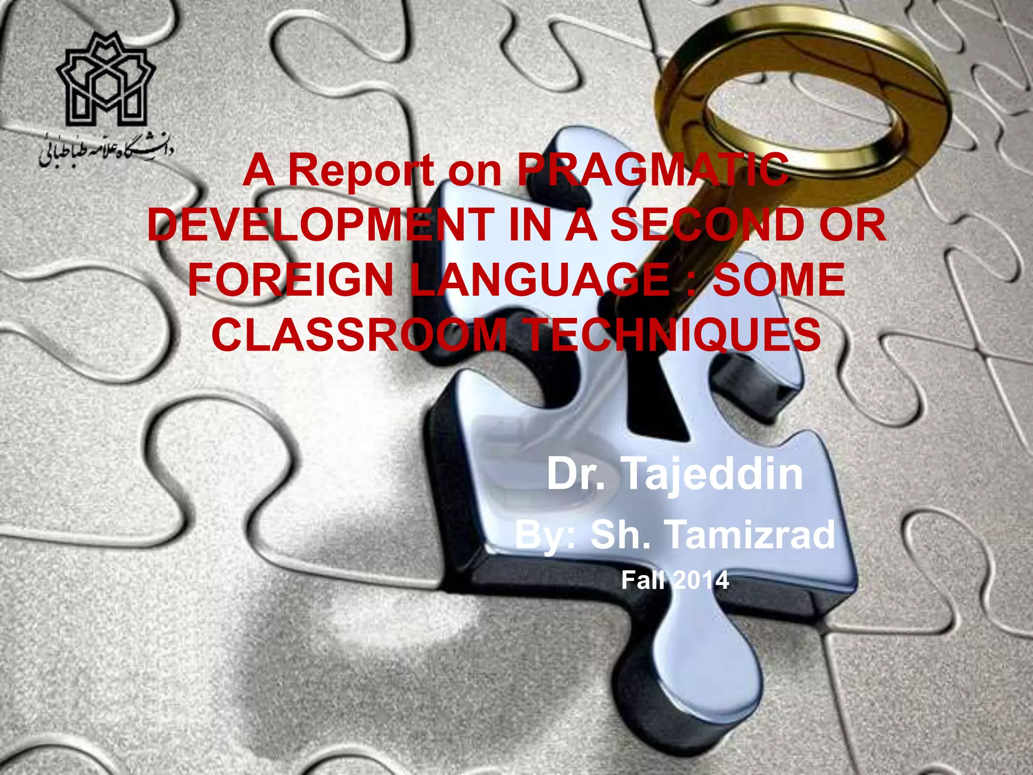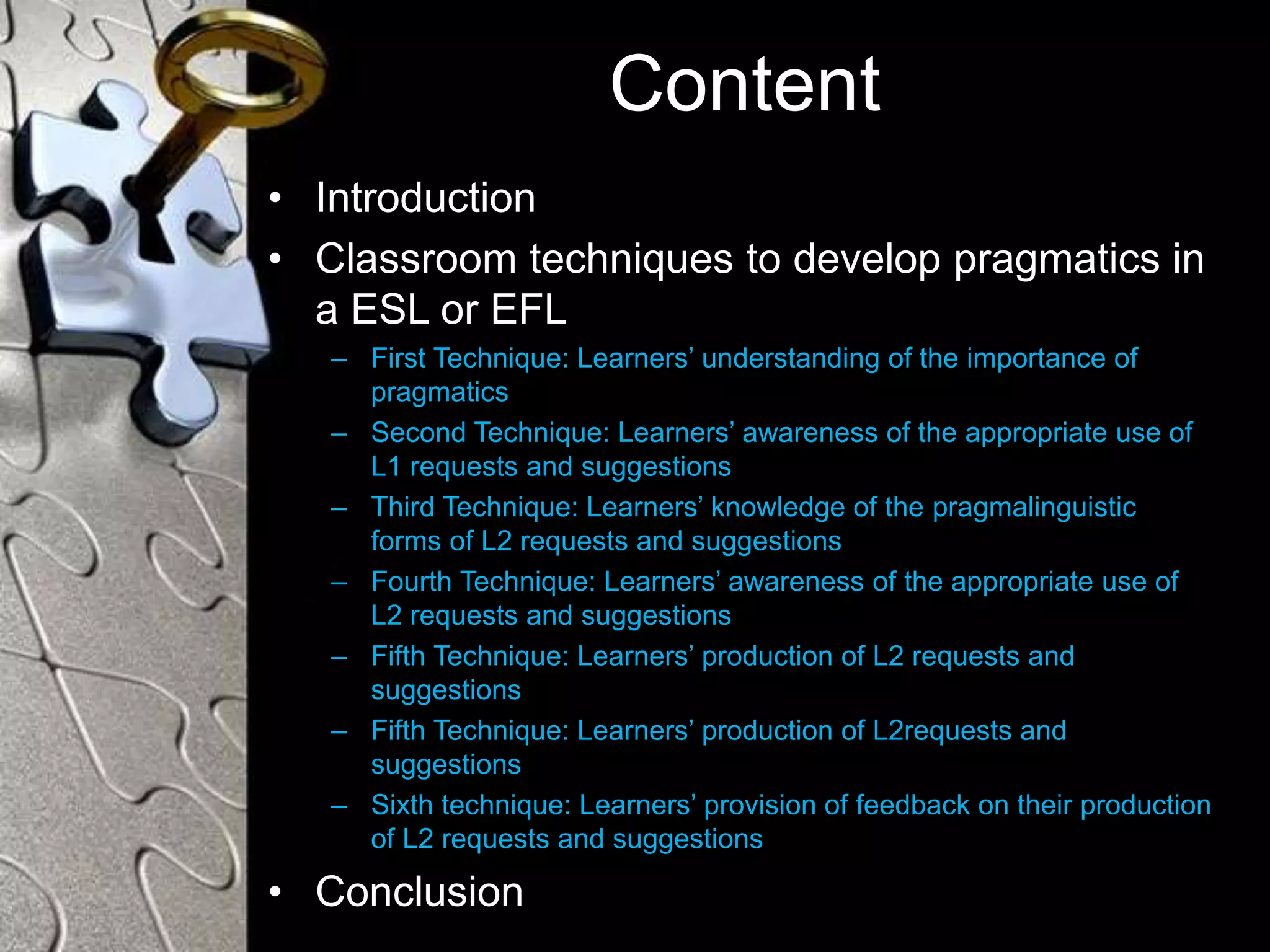 This document presents six classroom techniques for developing learner pragmatics in a second language. The techniques aim to raise learner awareness of appropriate request and suggestion forms and contexts in the L1 and L2. Learners first understand pragmatics' importance and request/suggestion speech acts. Next, they analyze L1 examples and compare request/suggestion forms across contexts. Then, they learn target language forms and practice determining appropriateness. Learners then produce oral and written requests and suggestions in different contexts. Finally, they receive feedback on their productions to improve pragmatic competence. The goal is to expose learners to input, provide practice opportunities, and offer teacher feedback to develop pragmatic ability in the second language.