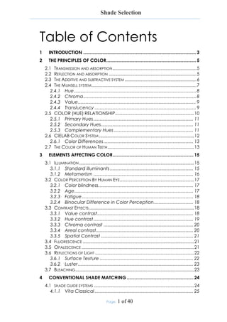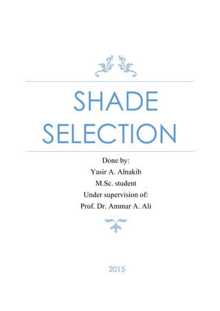 The document discusses the principles of color theory, specifically as it relates to shade selection in dentistry. It covers various color systems, influences on color perception, and the importance of understanding factors like hue, chroma, value, and translucency for effective shade matching. The knowledge of these aspects is essential for dental practitioners to achieve natural-looking restorations.