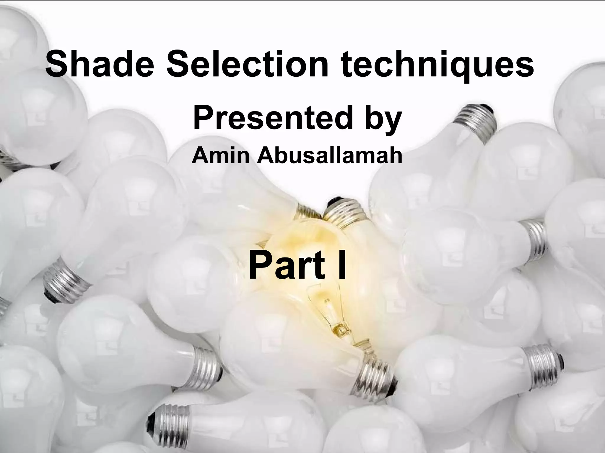 The document discusses various shade selection techniques for dental restorations, including using commercial shade guides to select the hue, chroma, and value of the shade by making comparisons under different lighting conditions. It focuses on the Vita Classic shade guide system and the recommended four-step process of hue selection, chroma selection, value selection, and final check/revision. Proper shade selection is important for achieving natural-looking dental restorations that match the colors of a patient's teeth.