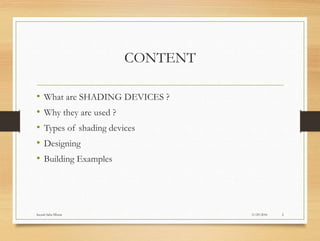 This document discusses shading devices, their purposes, types, and design considerations. Shading devices are used externally or internally in buildings to protect from direct sunlight and create a comfortable interior environment. They can reduce cooling loads and costs by decreasing heat gain, while also improving comfort and aesthetics. Common types include internal devices like curtains, blinds, and louvers, and external horizontal, vertical, and egg-crate shading. Effective shading design considers the sun path and dimensions to block sunlight at different angles. Examples of shading designs in buildings are provided.