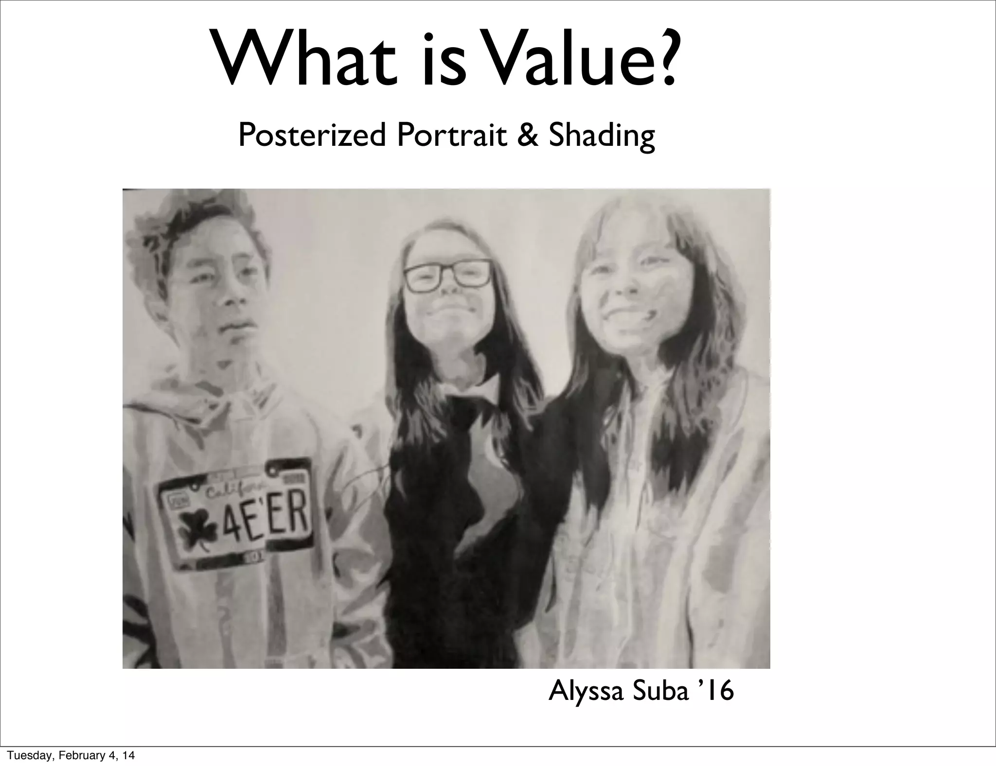 The document discusses value, shading, and photorealism in art. It defines value as the lights and darks in a work, and notes the range from black to white with shades of gray. Shading is applying media more or less densely to create light and dark areas. Photorealism aims to make images look like photographs through highly detailed rendering and sometimes using a grid technique. The document provides examples of photorealist Chuck Close's self-portraits and grid-based works, and shows student examples applying these techniques to portraits.