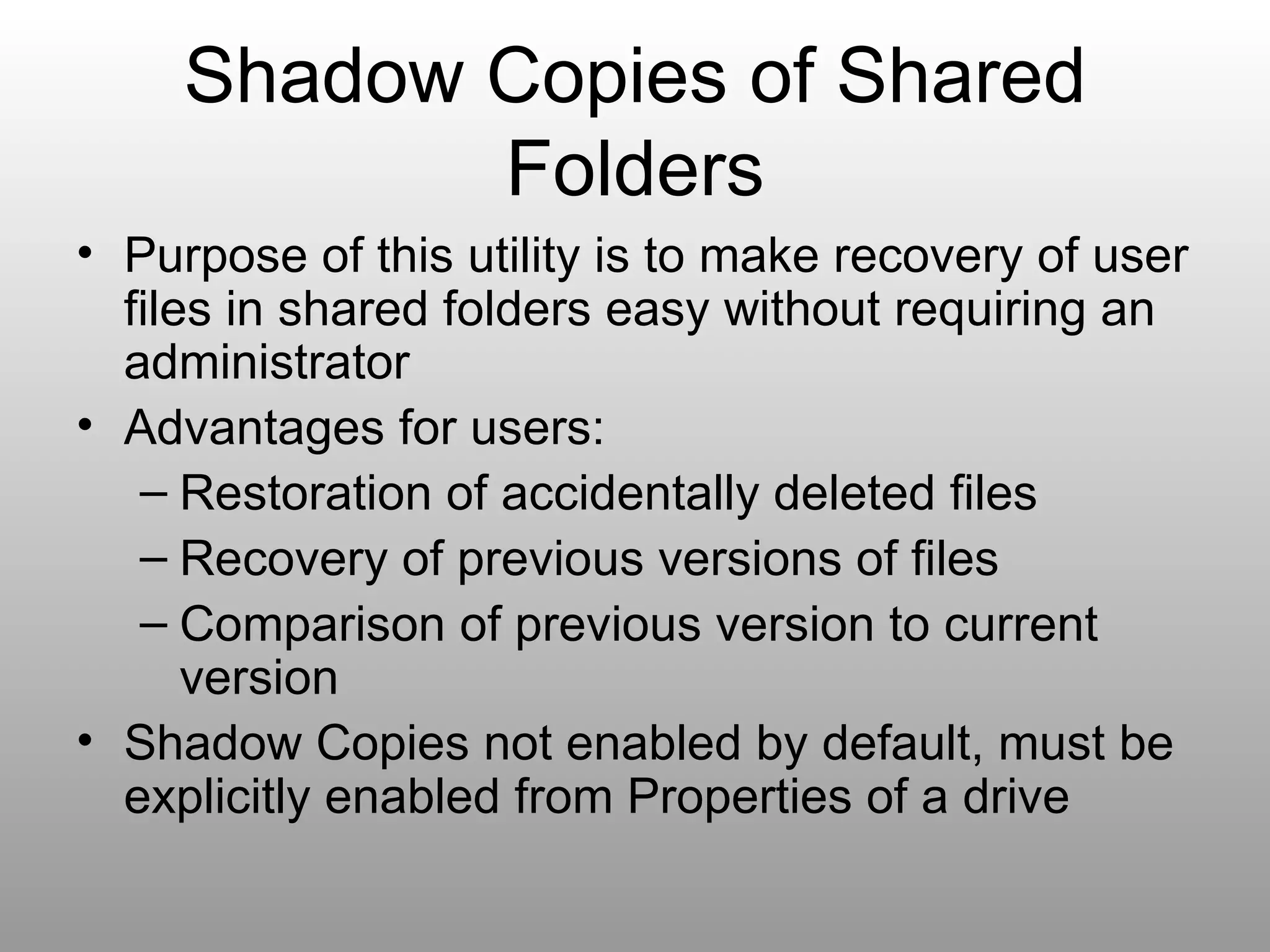 1. Shadow copies provide easy recovery of deleted or previous versions of files for users without administrator help.