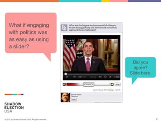 The document proposes a new social media platform called Shadow Election to engage users with politics. It aims to make politics more accessible through game-like interactions like rating videos and casting virtual votes. Content from all sides of issues will be sourced to avoid ideological bubbles. The platform is designed to be shared on social networks to encourage debate and activism. It aims to increase voter turnout, especially among youth. Concerns around privacy and bias are addressed. The platform launched successfully in Finland and seeks US funding to launch for the 2012 elections.