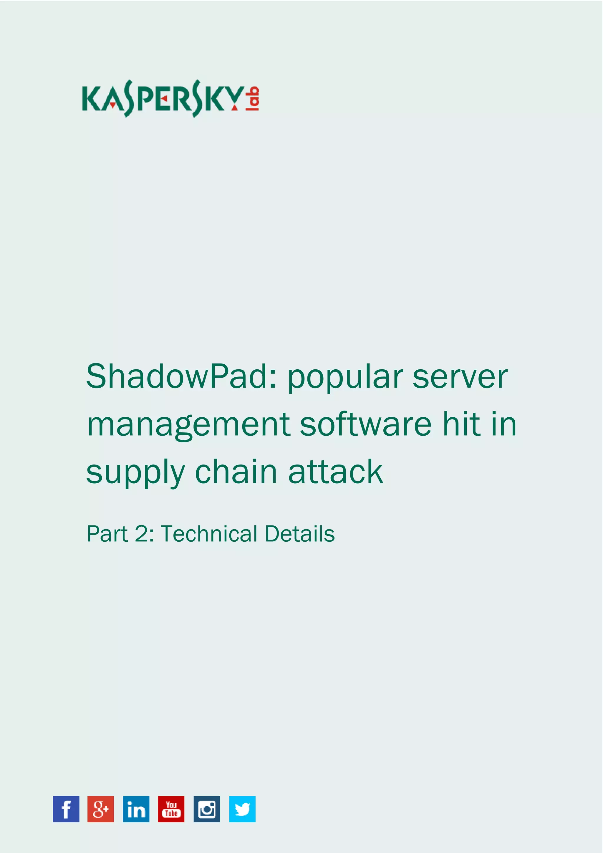The document summarizes technical details about ShadowPad, a modular cyber attack platform deployed through compromised software. It describes how ShadowPad operates in two stages, with an initial shellcode embedded in legitimate software that connects to command and control servers. The second stage acts as an orchestrator for five main modules, including for communication, DNS protocols, and loading additional plugins. Payloads are received from the C&C server as plugins and can perform data exfiltration.