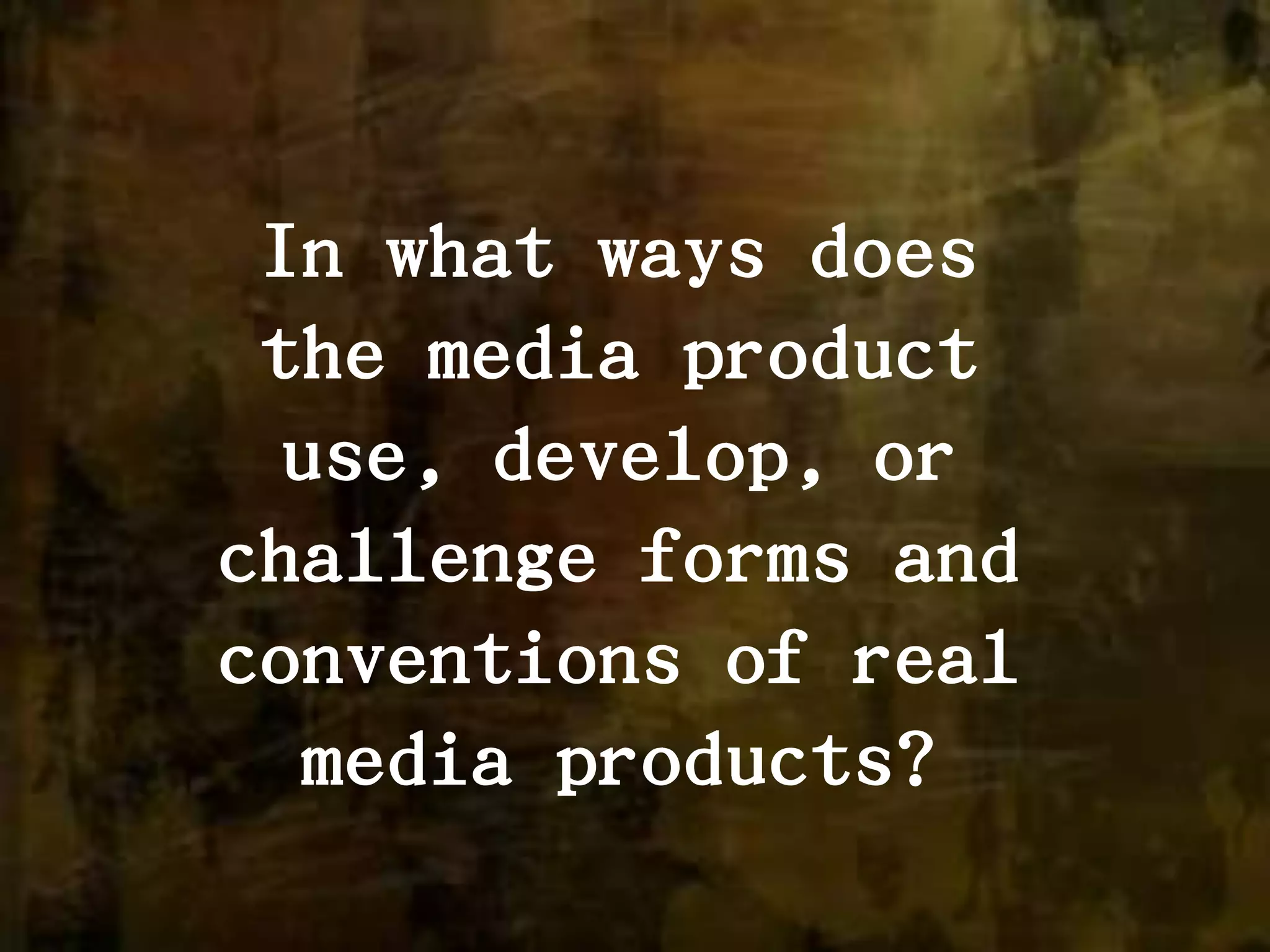The document discusses how the media product challenges conventions of real media products through its use of nonlinear narrative, unusual shots and editing techniques. It establishes continuity during filming through obeying the 180 degree rule and tries to match color grading when issues arise. It also uses flashbacks, fast pacing and an atypical ending to subvert expectations of the thriller genre while still including elements like ominous music, shadows and a dual protagonist-villain perspective. The film aims to engage audiences through relatable characters, themes of truth and illusion, and providing an emotional and mentally escapist experience.