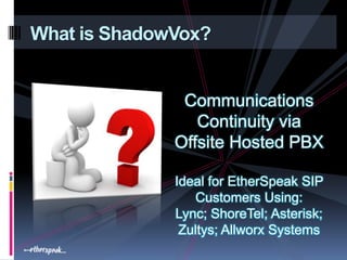 ShadowVox is a cloud-based IP PBX backup system designed to ensure communication continuity for Etherspeak SIP customers using various phone systems. It mirrors existing phone settings and offers advanced features such as voice and fax calls, secure messaging, and video-over-IP at competitive prices. ShadowVox promotes business continuity by keeping communications active during disruptions, providing peace of mind with geographic redundancy.