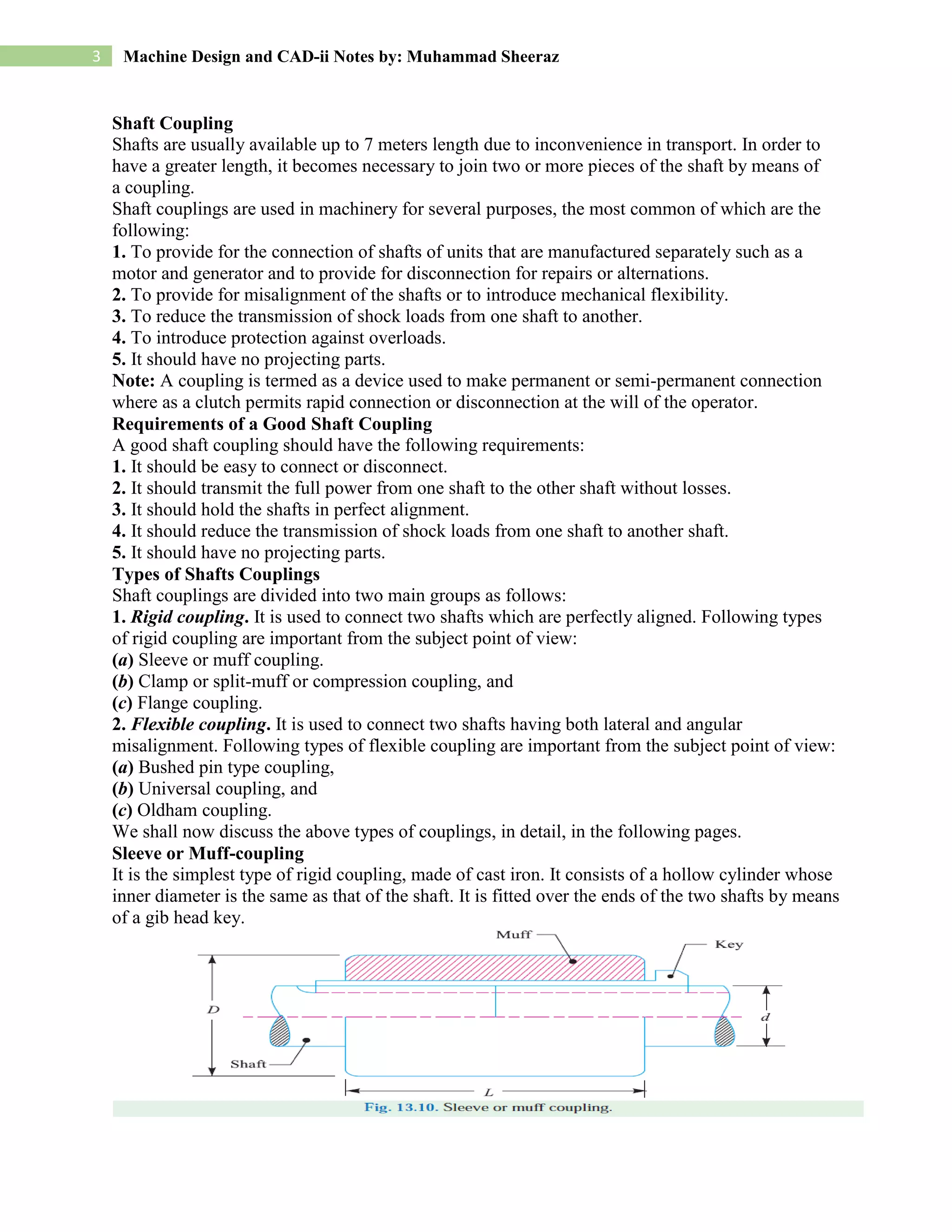This document provides an overview of shaft couplings used in machinery for connecting shafts, accommodating misalignment, reducing shock loads, and offering overload protection. It outlines the requirements of a good shaft coupling and classifies couplings into rigid and flexible types, detailing examples of each. Furthermore, it describes the sleeve or muff coupling as a simple type of rigid coupling made of cast iron.