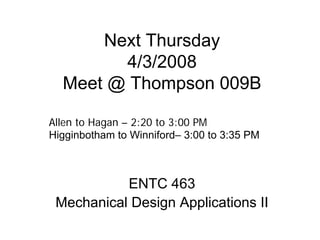The document discusses shaft design and analysis. It provides information on forces acting on shafts, developing shear and moment diagrams, stress concentration factors, fatigue failure criteria, and the ANSI shaft design equation. An example is presented to demonstrate calculating torque and forces on a shaft, developing shear and moment diagrams, and determining the shaft diameter at critical locations using the design equation.