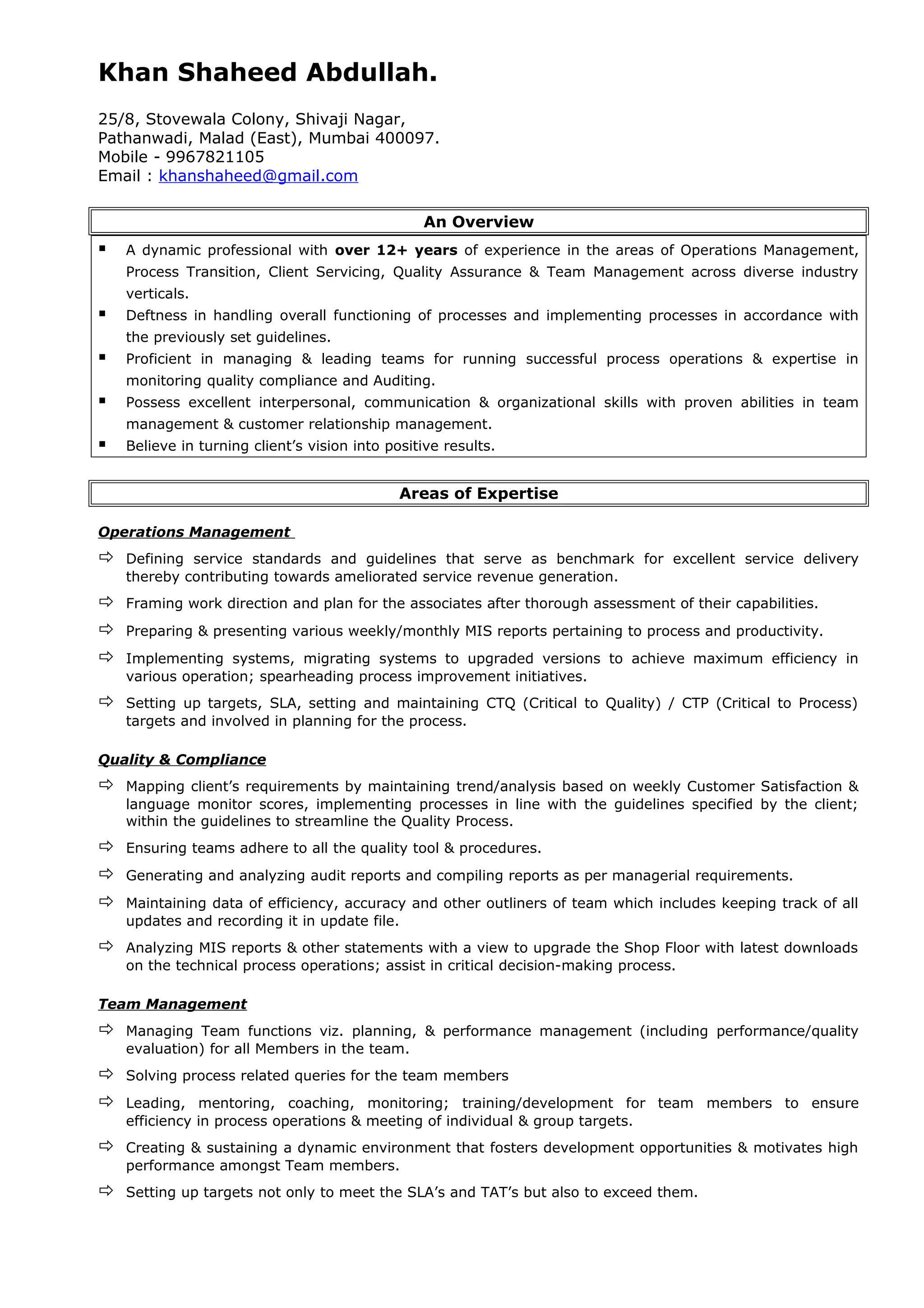 Khan Shaheed Abdullah is a dynamic professional with over 12 years of experience in operations management, process transition, quality assurance, and team management across diverse industries. He is proficient in managing teams, monitoring quality compliance, and auditing. His areas of expertise include operations management, quality and compliance, and team management. He has worked in roles such as associate, workflow coordinator, senior executive, and executive at companies including Mercator Info Service India, Integreon Managed Solutions, Birla Sunlife, and Medusind Solutions.