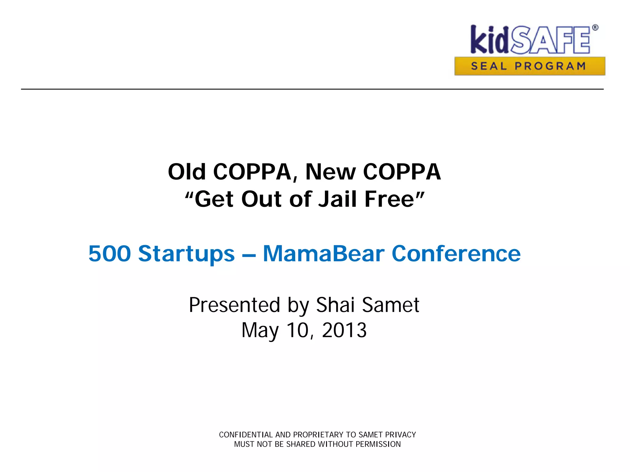 This document discusses changes to the Children's Online Privacy Protection Act (COPPA) and strategies for companies to comply. It outlines what new types of personal information are regulated, such as geolocation, photos/videos, and behavioral advertising. Companies face fines for noncompliance. The document suggests techniques like anonymizing child data and directing sites to older users. It recommends parental email consent and avoiding ID collection. Contextual ads and e-commerce are highlighted as viable revenue models. Distribution through curated kids' platforms and schools is advised.