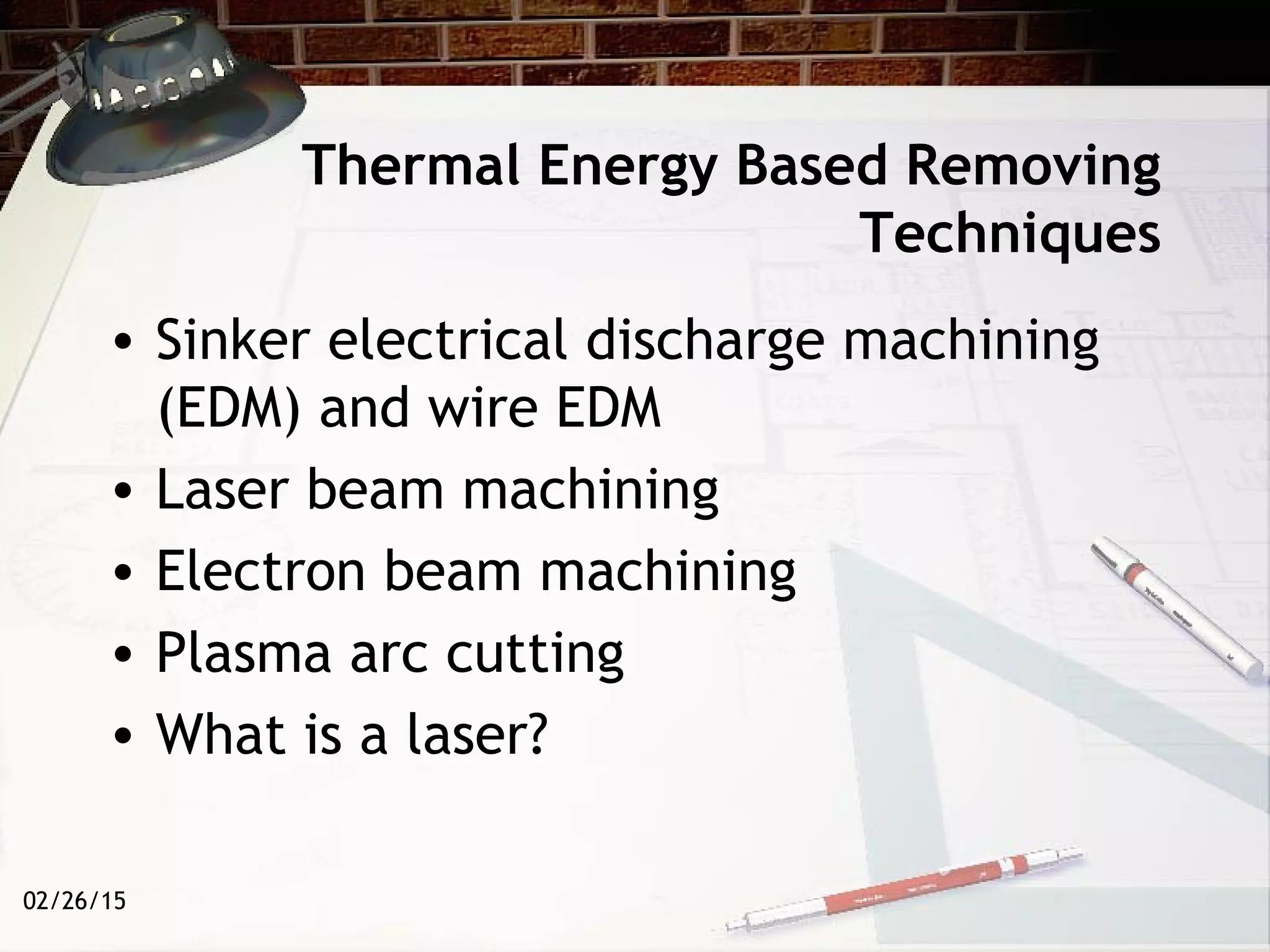 The document discusses various advanced manufacturing processes that use thermal energy or electrical discharges to remove material from a workpiece. It focuses on electrical discharge machining (EDM) and wire EDM. EDM works by sparking electrical discharges between an electrode and workpiece submerged in dielectric fluid to erode away material. Key advantages of EDM are its ability to machine hard metals and create complex shapes. The document also covers laser beam machining which uses a focused laser beam to melt, vaporize, or ablate material from the workpiece.