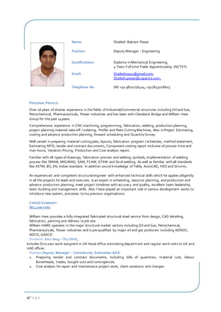 Shailesh Pawar has over 16 years of experience in structural engineering, fabrication, and project management for industrial projects. He has worked on numerous large oil, gas, and petrochemical projects. Currently he is the Deputy Manager at William Hare, where he is responsible for commercial activities like estimating, cost analysis, and budget management. Previously he held roles like Head of Planning and Planning Engineer, where he managed project scheduling, resource planning, and ensured projects were delivered on time and on budget. He has comprehensive experience in all aspects of structural steel fabrication and erection.