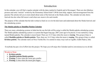 The document introduces a Hindu calendar for the year 1933 according to the Shukla paksha or Shuddha paksha calendar system. It provides the dates in both English and Devanagari scripts along with information on Hindu festivals. The calendar was created by elementary school children to help them learn about the Hindu festival dates and calendar system through articles and illustrations.