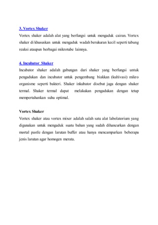 1. Shaker laboratorium digunakan untuk mencampur larutan secara homogen dengan gerakan satu arah.