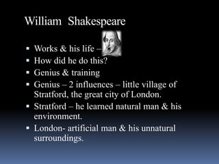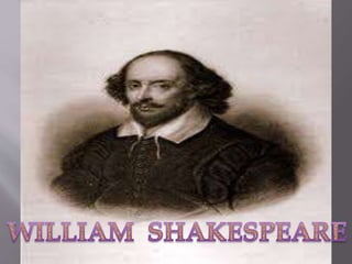 William Shakespeare was a renowned English playwright and poet born in 1564 in Stratford-upon-Avon. He wrote some of the most famous plays in English literature, including tragedies like Hamlet, King Lear, and Macbeth as well as comedies such as A Midsummer Night's Dream and The Tempest. The document discusses Shakespeare's life and upbringing, his career in London writing and acting in plays, his works categorized by genre and period, and his legacy as one of the greatest writers in the English language.