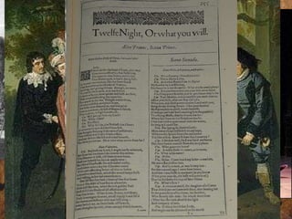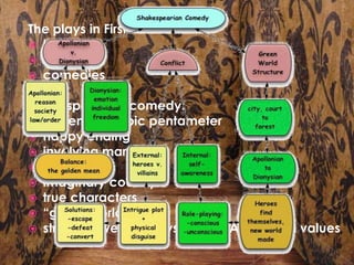 Shakespearean comedies are characterized by having happy endings, involving marriages, taking place in imaginary countries, and featuring true characters. They use puns and mistaken identities as common plot devices. The document then lists Shakespeare's comedies and provides some key details about Twelfth Night, such as it being set during Twelfth Night's entertainment and involving mistaken identity through the character of Viola disguising herself as Cesario.