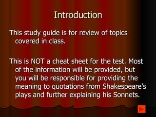 This document provides an overview of William Shakespeare and some of his major plays and sonnets. It discusses Shakespeare's background, some of his most famous plays including Richard III, Much Ado About Nothing, Macbeth, and Measure for Measure. It also summarizes 3 of Shakespeare's sonnets. Key details about characters, plots, and important quotes are provided for several of Shakespeare's plays. The document also includes images and information about Shakespeare's Globe Theatre.