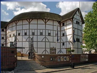 The Globe Theatre was a London theatre built in 1599 by Shakespeare's playing company, the Lord Chamberlain's Men. It burned down in 1613 but was rebuilt on the same site by 1614. The Globe was owned by actors as shareholders and was constructed using timber from an earlier theatre. It had an open-air courtyard that could hold over 1,500 people across three galleries surrounding the inner stage area.