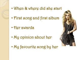 Shakira is a Colombian singer who started her artistic career at age 4 by dancing Arabic dance. Her first song, "Tus gafas oscuras", was composed at age 8 and dedicated to her father. Her debut album "Magia" was released when she was 13, and her second album "Peligro" was released at 15. Shakira has won two Grammys and ten Latin Grammys among her total of approximately 276 awards. The author enjoys Shakira's danceable music and meaningful lyrics, and cites her charity foundation helping Colombian children as evidence of her good character. Their favorite song is upbeat and danceable with positive lyrics.