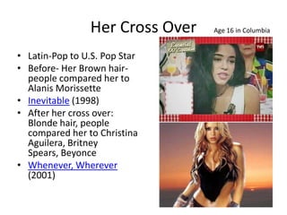 Shakira was born in Colombia to Colombian and Lebanese parents. She began her singing career in Colombia at age 13 and crossed over to the US pop music scene in 2001 at age 24. To appeal to US audiences, she dyed her hair blonde and sang primarily in English, adapting to mainstream US pop styles. While this helped her commercial success, some criticized her for abandoning her Latin roots and folk/rock influences. Shakira believes she remains true to her Latin identity while gaining new international fans.