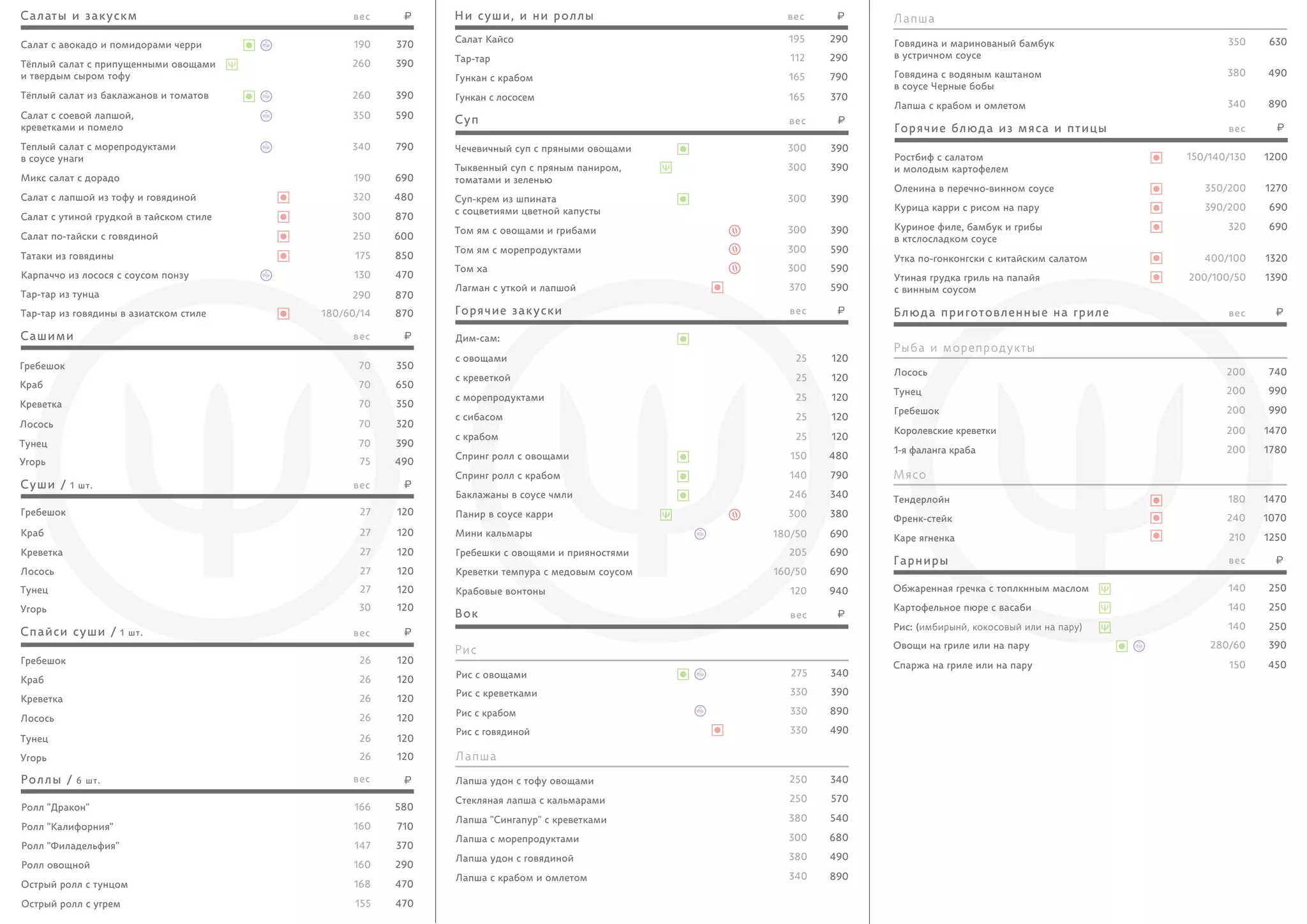 Документ представляет собой меню ресторана, включая разнообразные закуски, салаты, супы, горячие блюда и десерты. В меню перечислены элементы с их весом и ценами, а также указаны рекомендации для вегетарианских и острых блюд. Также указаны контактные данные ресторана.