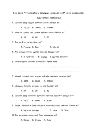 амьтдын ангилал зүй” нэгж хичээлийн шалгалтын материал 1. Дэлхий дээр хэдэн зүйлийн загас байдаг вэ? А. 10000 Б. 20000 В. 21000 2. Монгол оронд хэд орчим зүйлин загас байдаг вэ? А. 50 Б. 60 В. 70 3. Аль нь 2 нутагтан биш вэ? А. Гүлмэр Б. Бах В. Могой 4. Аль ангид хүйтэн цустай амьтад байдаг вэ? А. 2 нутагтан Б. Шувуу В.сүүгээр бойжигч 5. Мөлхөгчдийн ангийн ангилалыг нөхөж бич ............................................, ............................................... ............................................, ............................................... 6. Манай дэлхий дээр хэдэн зүйлийн мөлхөгч тархсан бэ? А. 4000 Б. 8000 В. 16000 7. Шувууны биеийн дулаан нь хэд байдаг вэ? А. 37 Б. 39 В. 42 8. Дэлхий дээр хичнээн зүйлийн сүүгээр бойжигч байдаг вэ? А. 4500 Б. 5000 В. 6000 9. Өндөг төрүүлэгч буюу анхдагч араатанд ямар амьтан багтах вэ? А. Нугасан хошуут Б. Имж В. Чоно 10.Аль нь шавж идэштний багт хамаарах вэ? А. Зараа Б. Зурам В. Буга