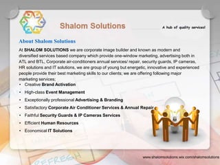 Shalom Solutions is a diversified services company based in Multan, Pakistan that provides marketing, advertising, facilities maintenance, security, HR, and IT solutions. It has a team of experienced professionals and offers services like brand activation, event management, advertising, facility repairs, security, and human resources. The company aims to build long-term relationships with clients and provide world-class service. It has offices in major Pakistani cities and works with a network of marketing associates across the country.