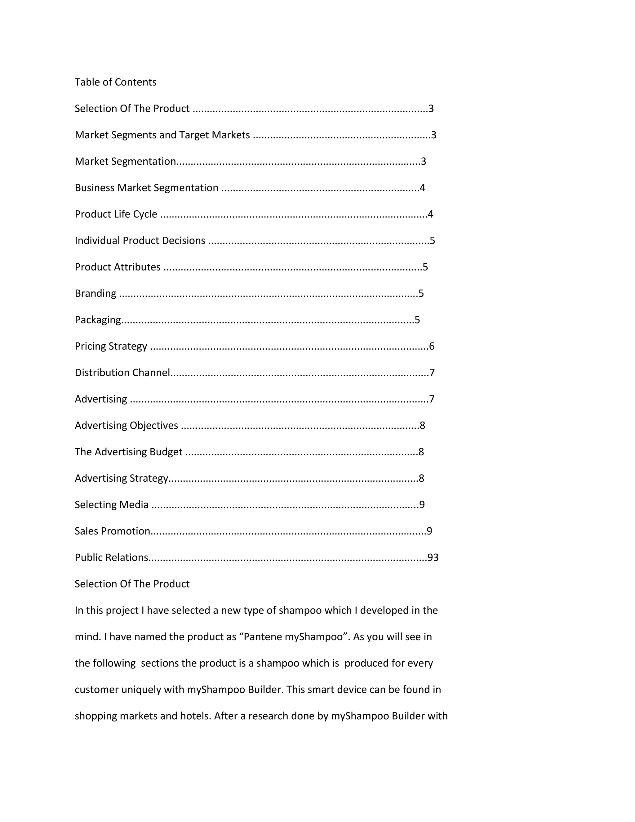 The document provides details on the marketing plan for a new personalized shampoo product called Pantene myShampoo. Key aspects of the plan include segmenting the market based on individual customer needs and targeting the international market. The product is currently in the design phase. Marketing strategies will include promotional pricing initially, distribution through retail stores and hotels, and an advertising budget of over 2 million euros utilizing various media. Sales promotions will offer 50% off for first-time purchases to encourage trial.